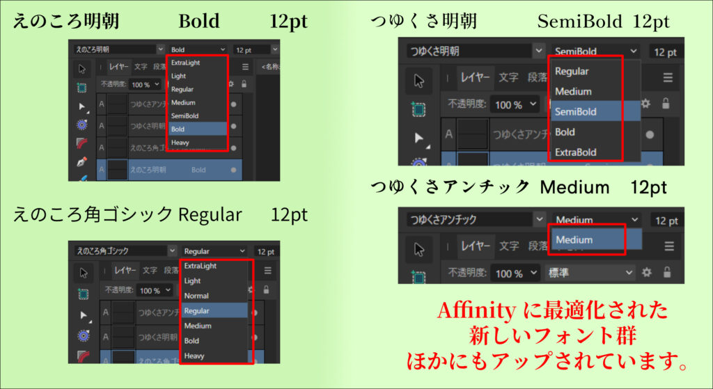 Affinity Designerでは両者のフォントを何の区別も無く、自然に選択し使用する事ができます。