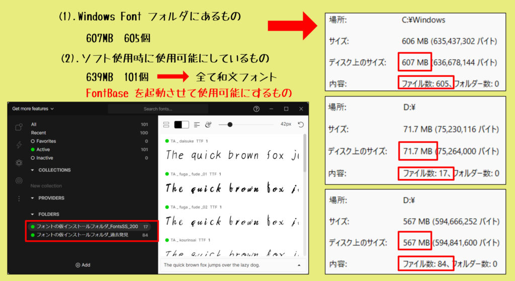 上の例をご覧ください。本来のfontフォルダには 607MB・605個のファイルがあります。