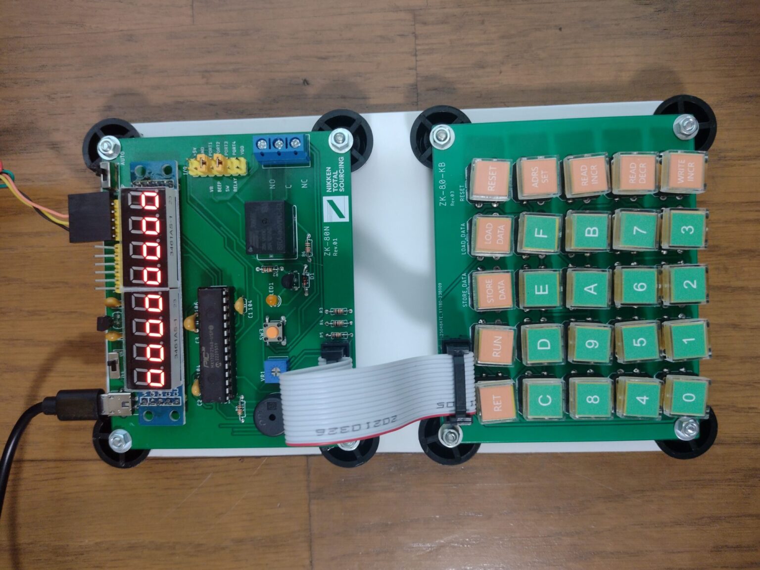 パソコンでプログラムを書いて、機械語はケーブルで送信します。